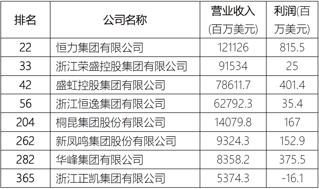 今年500家上榜的中国公司中,共有8家化纤相关企业上榜,分别为恒力集团、荣盛集团、盛虹集团、恒逸集团、桐昆集团、新凤鸣集团、华峰集团、正凯集团。