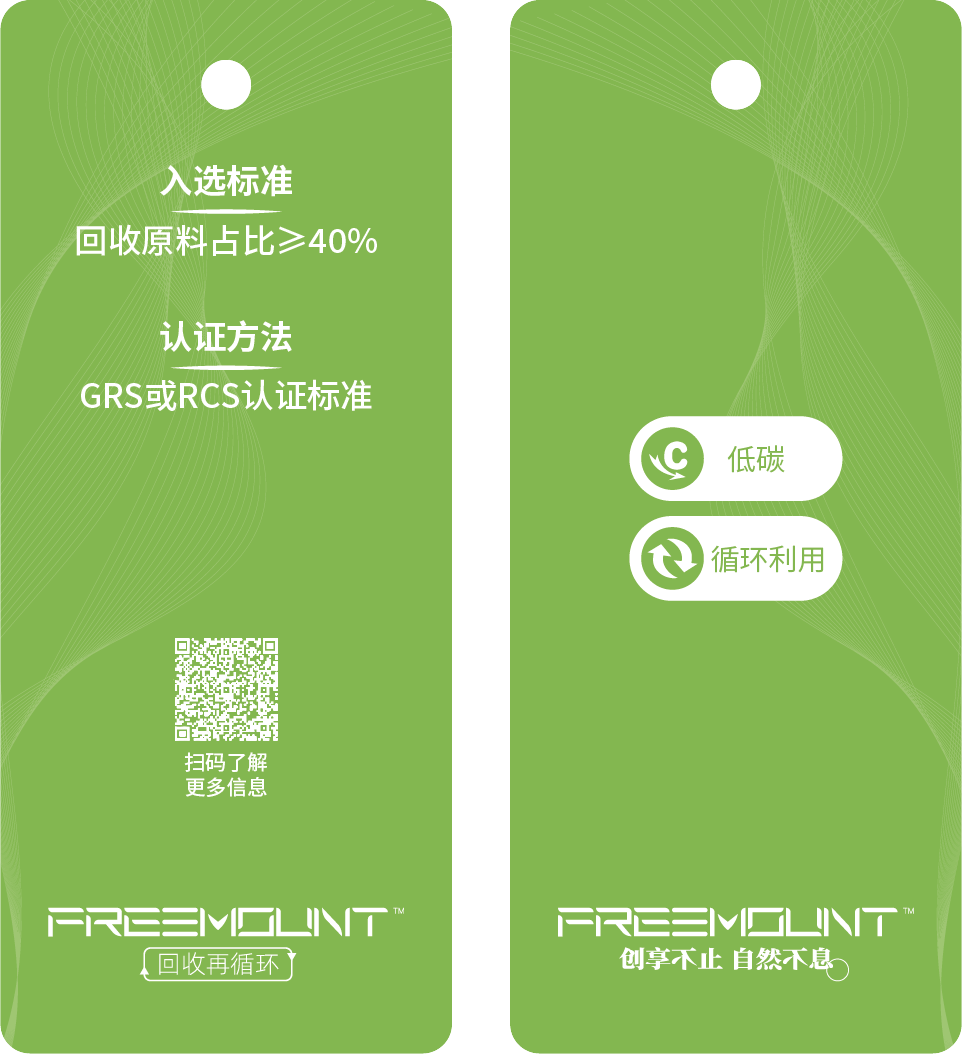 FREEMOUNT ? 始终坚信, 凭借持续创新的力量,人类发展与自然生态之间能够达成一种珍贵的平衡。自诞生之初, 品牌便以“低碳、健康、清洁”为价值基石,不断拓展材料行业的边界——从生物基到回收再生,从可降解到水性及无溶剂体系,从低碳生产过程到覆盖全生命周期的碳减排解决方案,FREEMOUNT ? 持续探索、大胆定义属于可持续时代的材料新范式,而这一路探索的背后,是贯穿品牌生命的三大核心价值观:自然无束、创新无尽、共享无界。