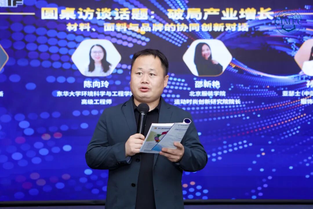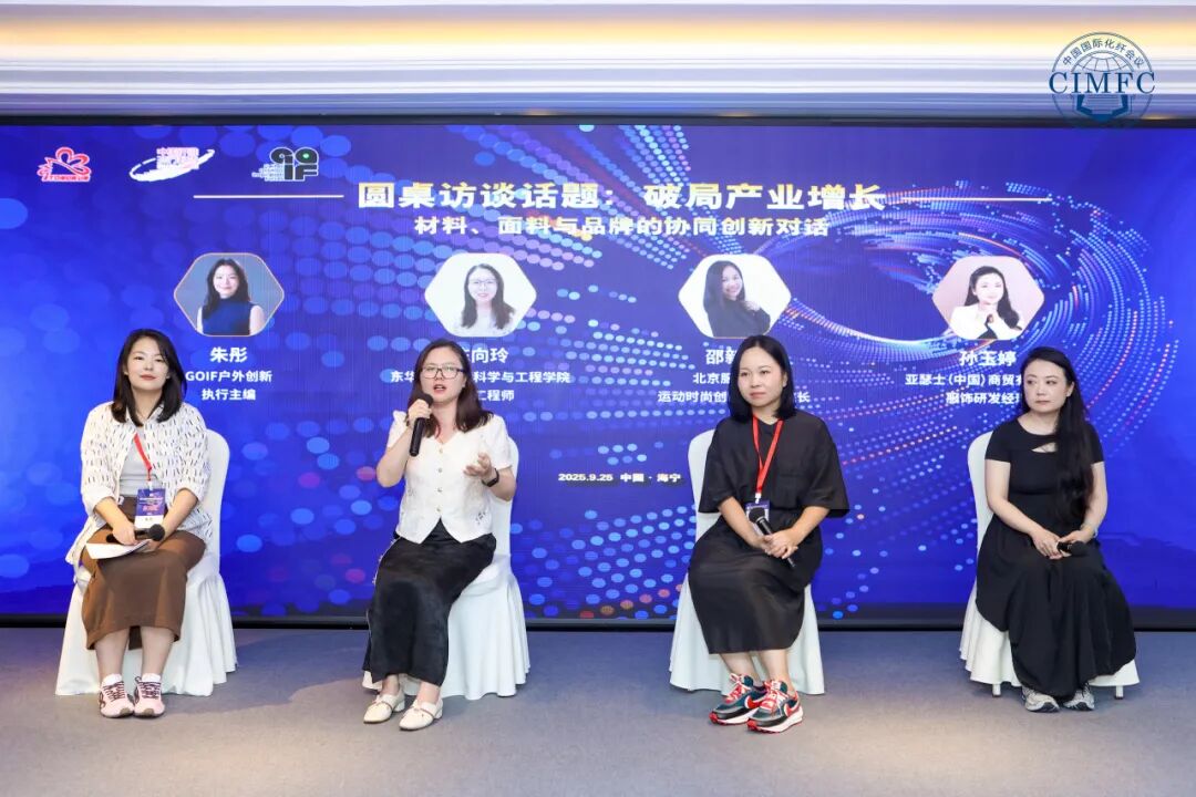 在圆桌访谈环节,主持人GOIF户外创新执行总编朱彤与东华大学环境科学与工程学院高级工程师陈向玲,北京服装学院教授、运动时尚创新研究院院长邵新艳,亚瑟士(中国)商贸有限公司服饰研发经理孙玉婷以“破局产业增长”为主题,围绕材料创新方向、研发成果转化、生活方式变革等内容展开深度对话,勾勒出以技术创新为基石、以产学研合作为桥梁、以市场需求为导向,深度协同材料、面料与品牌三方资源,迈向价值共生新生态的发展路径。