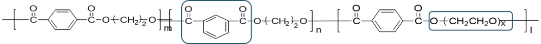 NEDDP的分子结构设计是在原有PET分子结构的基础上,借鉴“基因嫁接”理念,将具有间位结构的间苯二甲酸(IPA)和含有醚键(–O–)的柔性链聚乙二醇(PEG)等结构单元引入到聚合大分子链中,通过酯化-原位缩聚反应,形成如图所示的多元共聚酯结构。