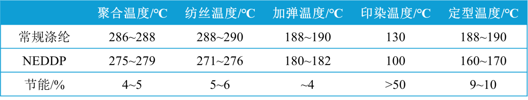 NEDDP分子结构设计是在前人研究成果的基础上进行的跟踪创新,它没有止步于实验室,而是成为支持产业化实施的基础,是科技创新与产业化深度融合的典范。实践证明,NEDDP纤维不仅在多项性能上实现了对常规涤纶的迭代升级,同时在节能减排、推动绿色发展方面也取得了显著成效。NEDDP纤维的主要特点包括: