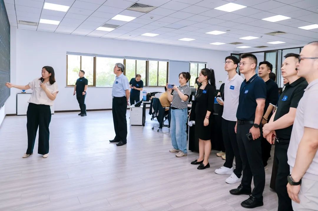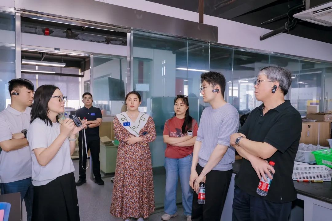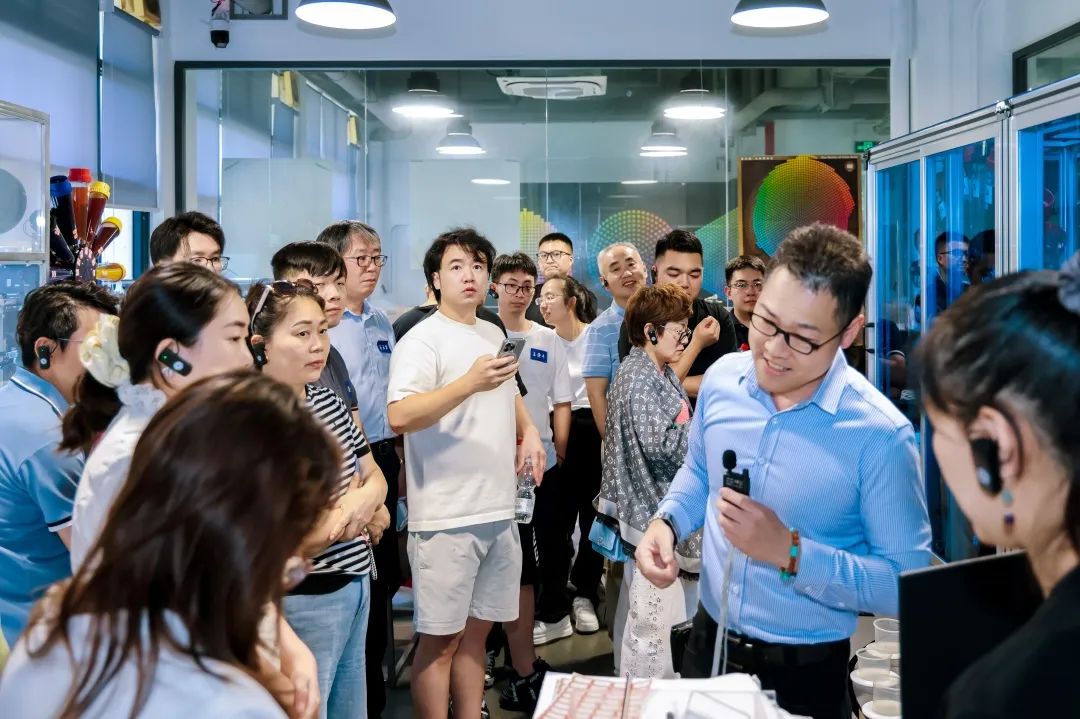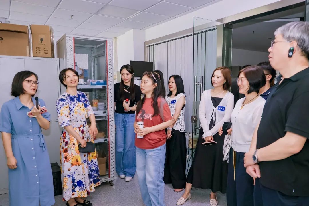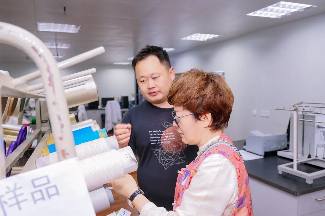在东华大学化学与化工学院院长武培怡、染整实验室主任杨卓、办公室主任朱晓旭的带领下,学员们参观了成果展示室和染整实验室。坚持“四个面向”,学院不断提升科技创新能力,围绕功能分子及功能材料在绿色化工领域的应用、智能聚合物材料的基本性质和应用拓展、光功能材料的开发和性能调控、表面化学过程的高时空分辨测量与微观机制等展开研究,并取得系列进展。未来,学院将在光吸收材料的绿色合成及智能化构筑、智能分子创建及功能调控等领域展开重点攻关。此外,东华大学YP色彩研究中心副主任廖彦植详细介绍了YP色彩空间以及智能加色系统的功能及其应用,带给学员们全新的知识体验。