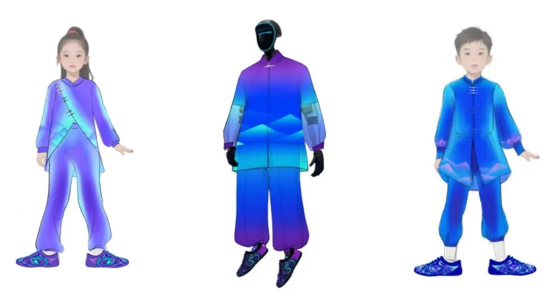 邵新艳教授团队(董思琪老师,研究生徐依文、梁美玫、鲁秋雨、王天宇等人)结合太极表演动作要求,以赛博风格的山水为设计主题,尝试将中国传统太极元素与机器人科技相结合。服装色彩以赛博朋克风格的蓝、紫、绿为基调,结合渐变山形纹样,呈现具有未来感的中式美学。