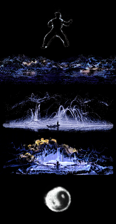 在科技与纤维材料的交融中,机器人带领小朋友们演绎了一场别开生面的太极表演。动作刚柔并济,意蕴悠长,展现出人与科技和谐共生的未来图景。背景视频以蓝紫色调渲染出赛博太极的奇幻氛围,粒子流动汇聚成山水意境,随音乐节奏起伏变幻。太极动作与旋转的八卦符号以粒子形态交织浮现,既呼应表演主题,又强化了视觉的动态韵律。整个演出以现代视觉语言重构太极哲学,在虚实之间,传递出纤维材料与科技相融的无限可能。